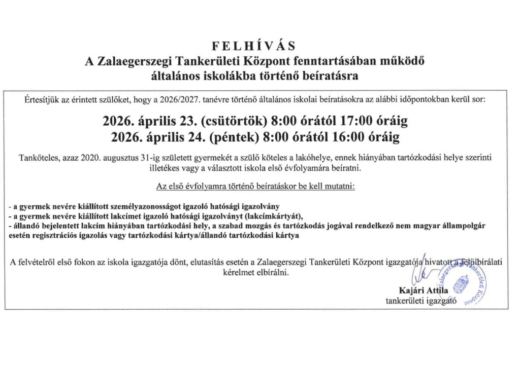 Kattintás után letölthetőek a 2026/2027. tanévre vonatkozó általános iskolai beiratkozást támogató, az előzetes jelentkezéshez is kapcsolódó szülői tájékoztató segédlet , illetve az általános iskolai beiratkozást támogató KRÉTA Beiratkozás modul felhasználói útmutatója.